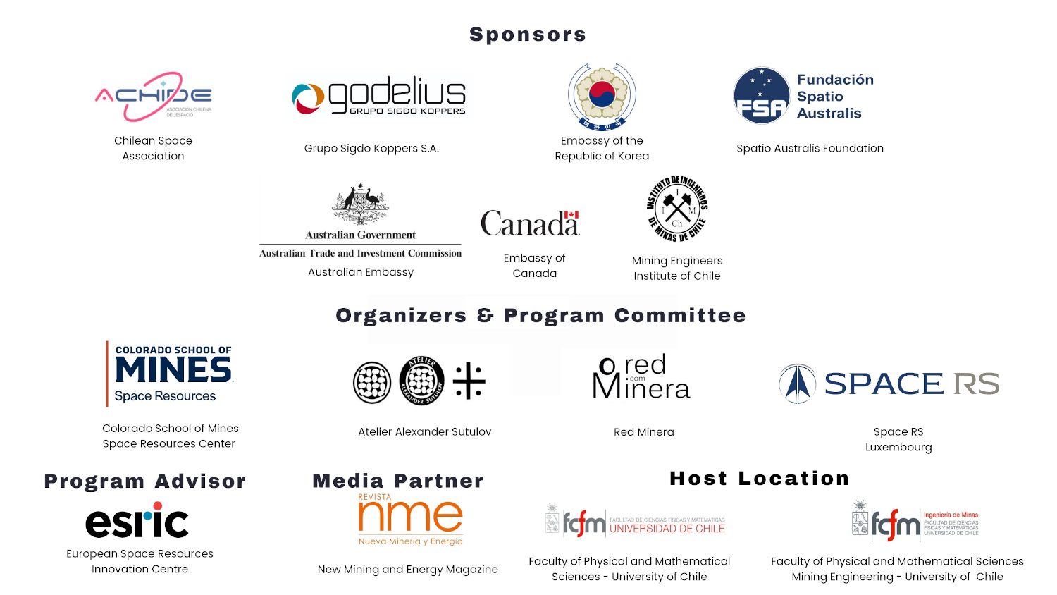 ORGANIZERS Alexander SutulovFounding Member, Space Resources Commission, Chilean Mining Engineering Institute (IIMCh) | Director, FOUR CORNER :: LAND PROJECT & IntiMERIKA Initiative Marco MuñozCEO, RedMinera & President, Space Resources Commission, Chilean Mining Engineering Institute (IIMCh) Ángel Abbud-MadridDirector, Center for Space Resources, Colorado School of Mines Javier ArrisueñoSenior Mining Consultant & Member, Space Resources Commission, Chilean Mining Engineering Institute (IIMCh) Carlos EspejelCEO, Spacer & Former Space Resources Utilization Lead, Ispace, Inc.